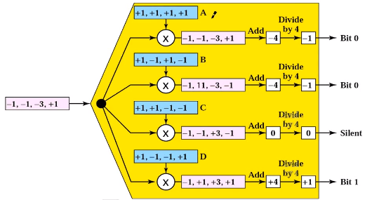Station A 의 데이터를 확인하려면 전송 받은 값 [-1,-1,-3,+1] 에 Station A [+1,+1,+1,+1] 을 곱함.