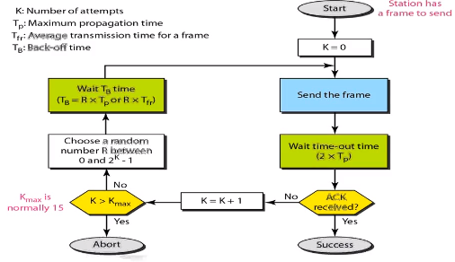 - ACK 이 오지 않아 타이머 초과시(eg: collision으로 인해) station 은 일정시간(backoff time)을 기다린 후 재송신을 한다. (기다리는 시간은 2의 n 제곱. n이 retry 마다 증가, 특정 횟수(backoff limit)이상 실패시 포기 후 재시도는 나중에)