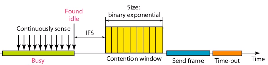 2) Contention Window : (=backoff time) 충돌시 일정 시간(2의 n제곱) 기다린 후 재전송 시도