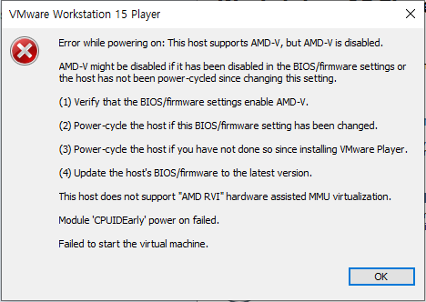| VMware 우분투 설치 오류 : This host supports AMD-V, but AMD-V is diabled (0) | 2020.09.09 |