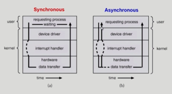 비동기식 입출력 : I/O 시작된 후 입출력 작업이 끝나기를 기다리지 않고 제어가 사용자 프로그램에 즉시 넘어감