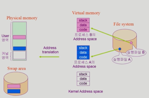 File System --> virtual memory --(Address transaction 논리메모리 주소를 물리 메모리 주소로 변환)--> physical memory