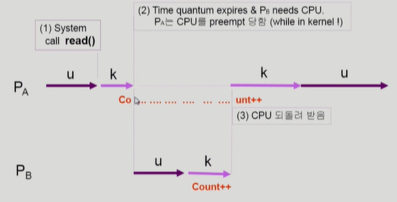 해결책 : 커널모드에서 수행 중일 때는 CPU를 preempt(선점) 하지 않음. 커널 모드에서 사용자 모드로 돌아갈 때 preempt