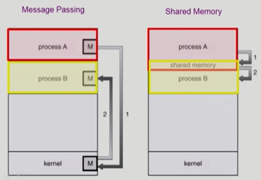 - message passing : 커널을 통해 메시지 전달. 프로세스 사이에 공유 변수를 사용하지 않고 통신하는 시스템