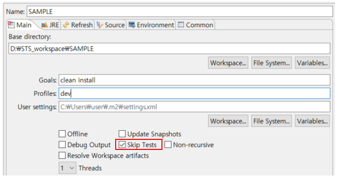 위에서 7번라인과 같이 skipTests 옵션 true 지정.