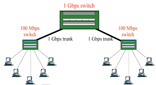 : 최소 프레임 64bytes 제한(CSMA/CD)이 없어졌으며, 10base5 의 500m + bridge 4개 = 2500m제한이 없어짐