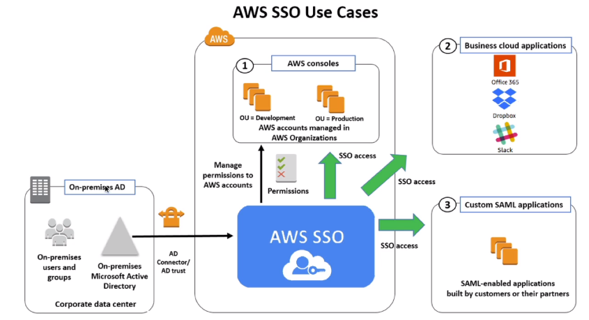 * SSO (Single Sign On) : 여러 AWS 계정 및 비지니스 앱에 대한 액세스를 중앙에서 관리 및 사용자에게 Single Sign-On 액세스 제공하여 할당된 모든 계정 및 앱을 한곳에서 액세스 가능케 하는 서비스